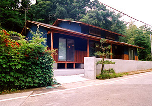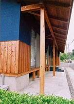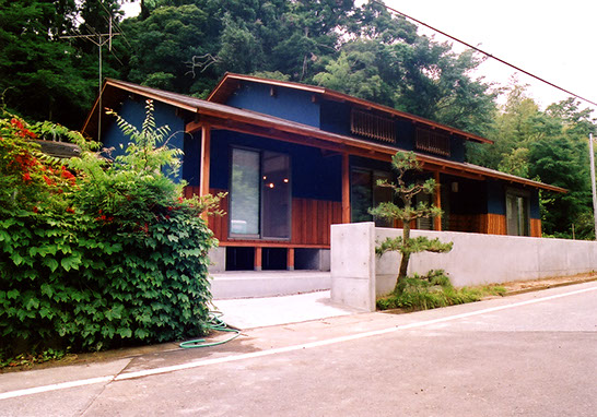 深海のように蒼い外壁カラーと杉板の腰壁の組み合わせがプロの味です。