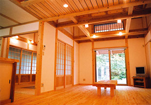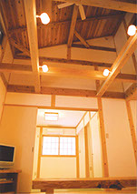 木の香るリビングを見上げると力強い井桁の梁の上にシーリングファン。