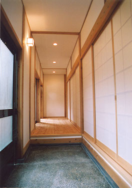 寺の本堂と渡り廊下でつないだ庫裏です。木造軸組の強さと美しさに、