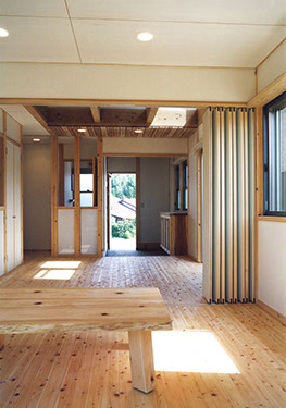 桧の床板が広がるリビング